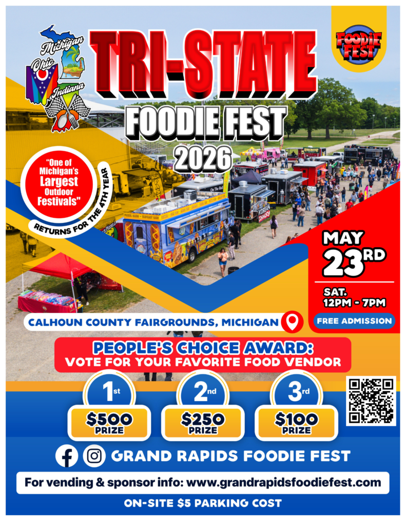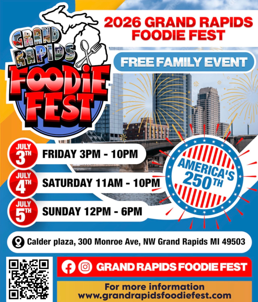 Grand Rapids Foodie Fest Explore our Events 5TH ANNUAL GRAND RAPIDS FOODIE FEST Days Hours Minutes Seconds Powered by Foodie Fest Foundation Foodie Fest events are produced by Foodie Fest Foundation, a 501c3 nonprofit dedicated to growing community food experiences. LEARN MORE DONATE Featured Events Grand Rapids Foodie FestJuly 3rd, 2026 • 3pm-10pmJuly 4th, 2026 •11am-10pmJuly 5th, 2026 • 12pm-6pm RSVP Tri- State Foodie FestMay 23, 2026 12pm-6pmcalhoun county fairgrounds, marshall, mi RSVP Become a Sponsor Is your business interested in becoming a sponsor or advertising during our annual Grand Rapids Foodie Fest? LEARN ABOUT OUR SPONSORSHIP BOOKLET HERE